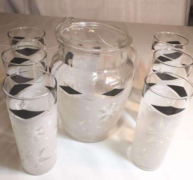 LOT 449 - Mid- Century ANCHOR HOCKING FROSTED SNOWFLAKE PITCHER & TUMBLER SET VINTAGE RETRO