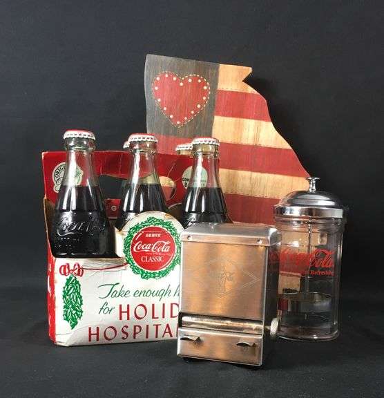 Vintage Coca-Cola Classic Holliday Hospitality Six Pack, 6" Coca-Cola Straw Dispenser, 4" Coca-Cola Toothpick Dispenser & 9" x 11" Wooden Georgia Sign