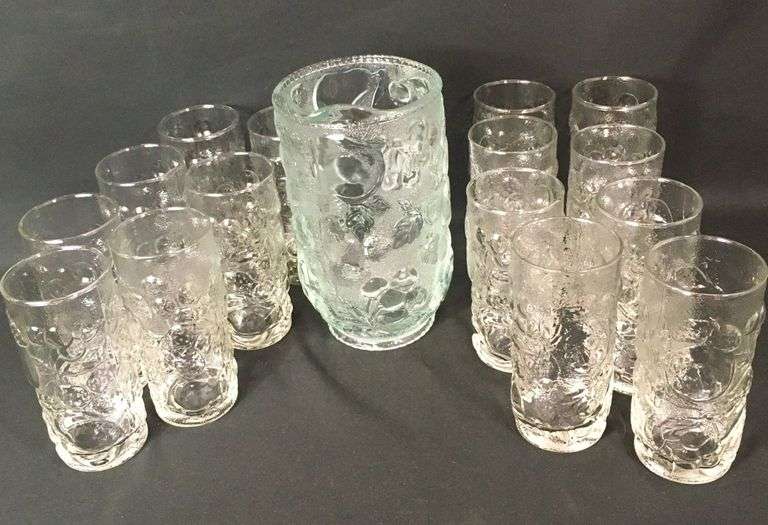 9" x 5.5" Vintage Glass Pitcher Pears, Cherries, Strawberries with 6" x 3" 15 Matching Drinking Glasses