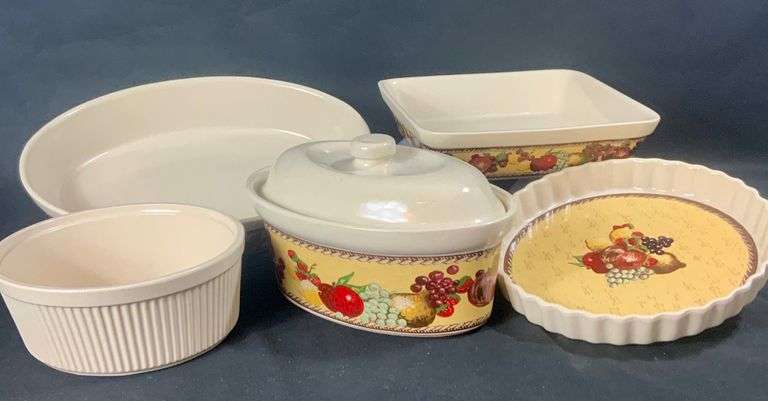 14” x 9.5” Oval Bowl, 8” x 3” Bowl, 9.5” Pie Dish, 9.5” Square Dish & 10” x 6” Oval Dish with A Lid. The lid has a small crack under the lid.
