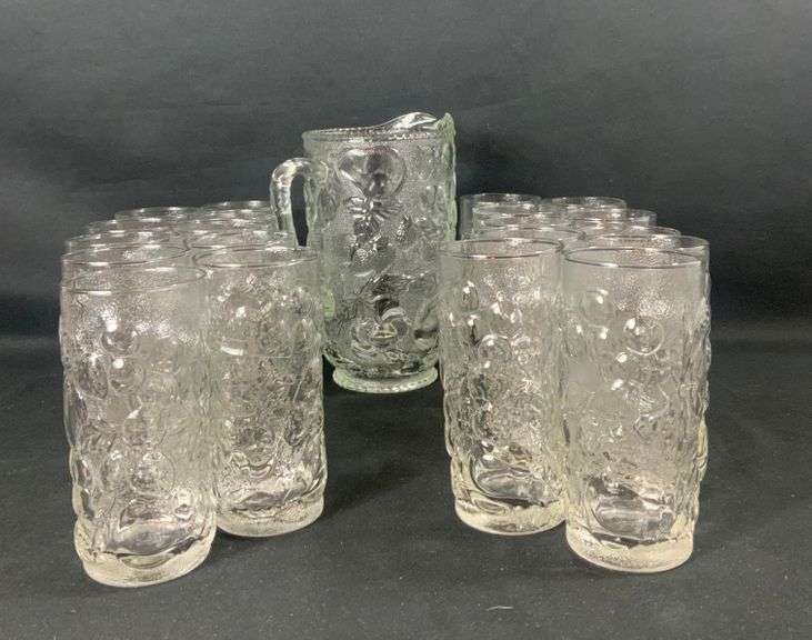 9" x 5.5" Vintage Glass Pitcher Pears, Cherries, Strawberries with 6" x 3" 19 Matching Drinking Glasses