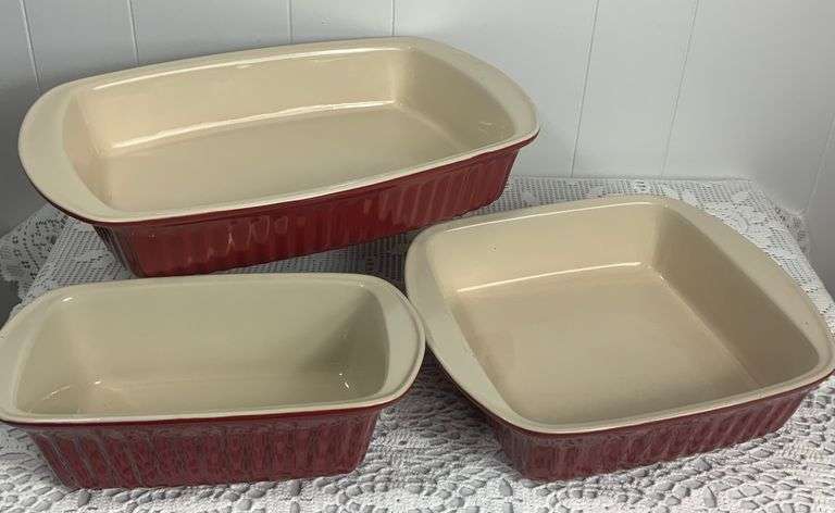 9" x 5" Bialetti Casa Italia Red Ceramic Stoneware Bread Loaf Pan, 9" x 9" Square Pan & 14" x 9.5" Casserole Pan.