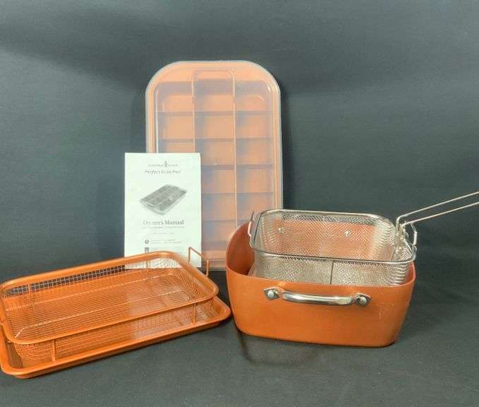 16" x 10" Copper Nonstick Bake Pan For Brownie Self Slicing Baking Pan Set, 9.5" x 12.5" Air Fryer Baking Sheet & 11" Pot With Steamer Grate & A Fryer Basket