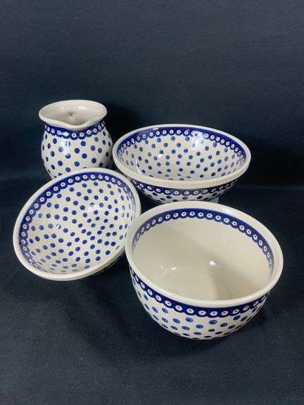 LOT 959 - Boleslawiec Polish Pottery Hand Made Bowl Peacock Dots Pitcher, Large Pasta Bowl, Large Salad Bowl & Medium Bowl