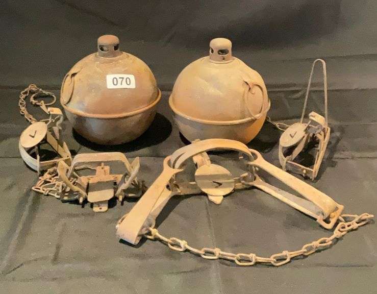LOT 070 - 4 Vintage Animal Traps & 2 Antique Toledo Smudge Pot Road Torch or a Traffic Lantern