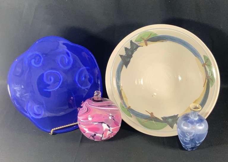 9” Blue glass plate, 10”W Pottery bowl, 4” glass ornament & 4” Small vase